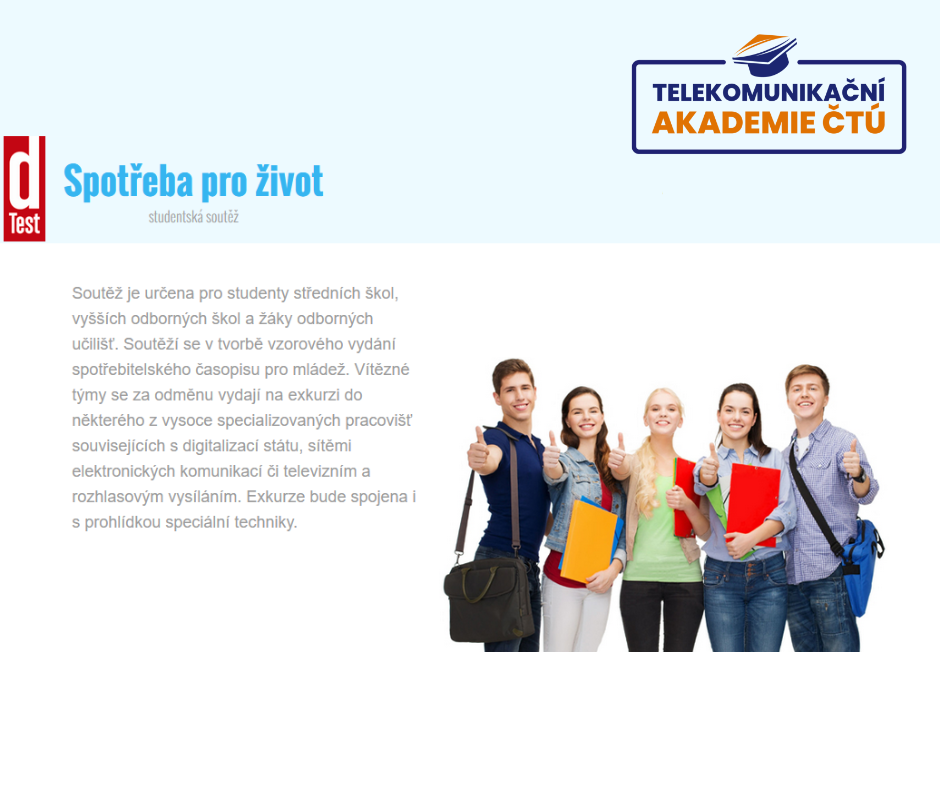 Spotřebitelské organizace dTest vyhlašuje 18. ročníku studentské soutěže Spotřeba pro život. I letošnímu ročníku udělil záštitu radní ČTÚ Mgr. Lukáš Zelený.
